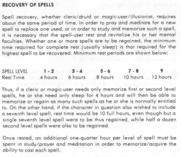 I have come to an interesting theory about AD&D and recovering spells while reading the DMG. Traditionally, I have always played that you wake up in the morning, memorize your spells, and go adventure. When you’re out of spells, that means its time to head back to town, sleep at the inn, and do it all again the next day. On the 13th, I played as a Magic-User in a game and ran into the problem of not knowing where the inn is. I used all my spells but the rest of the party was still good to adventure. So I found a safe spot, rested, then memorized a spell while other players did some adventuring. This got me thinking about how I would adjudicate it at my table and I remembered seeing a passage about it in the DMG.